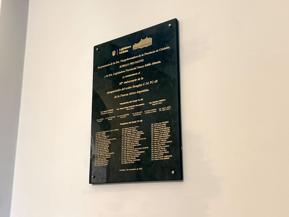 A 60 años de la mayor tragedia en la historia de la Fuerza Aérea Argentina, la Legislatura de Córdoba realizó este lunes a la tarde el primer homenaje a los 68 tripulantes y pasajeros, en su mayoría cordobeses, del avión Douglas C-54 Skymaster matrícula TC-48, desaparecido el 3 de noviembre de 1965, en circunstancias confusas, en Centroamérica. Se trató de un emotivo acto de reparación histórica para honrar la memoria de los 54 cadetes de la Promoción 31 de la Escuela de Aviación Militar, los 9 tripulantes y los 5 oficiales que viajaban en esa aeronave militar siniestrada.