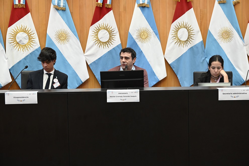 Luego, los 60 estudiantes de 4° a 7° año, asumieron el rol de senadores para debatir en torno a temáticas de relevancia nacional y provincial. En primer lugar, deliberaron sobre la Ley de Modernización Laboral, impulsada en el marco de la agenda de actualización del Estado argentino. En esta instancia, los senadores analizaron las implicancias de esta normativa sobre las relaciones de trabajo, los derechos de los trabajadores, la flexibilización laboral y el impacto en la estructura del empleo formal e informal en el país.
