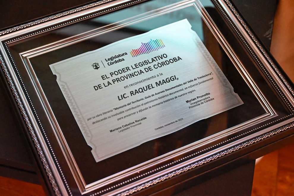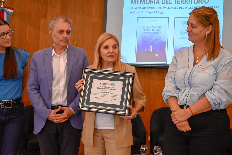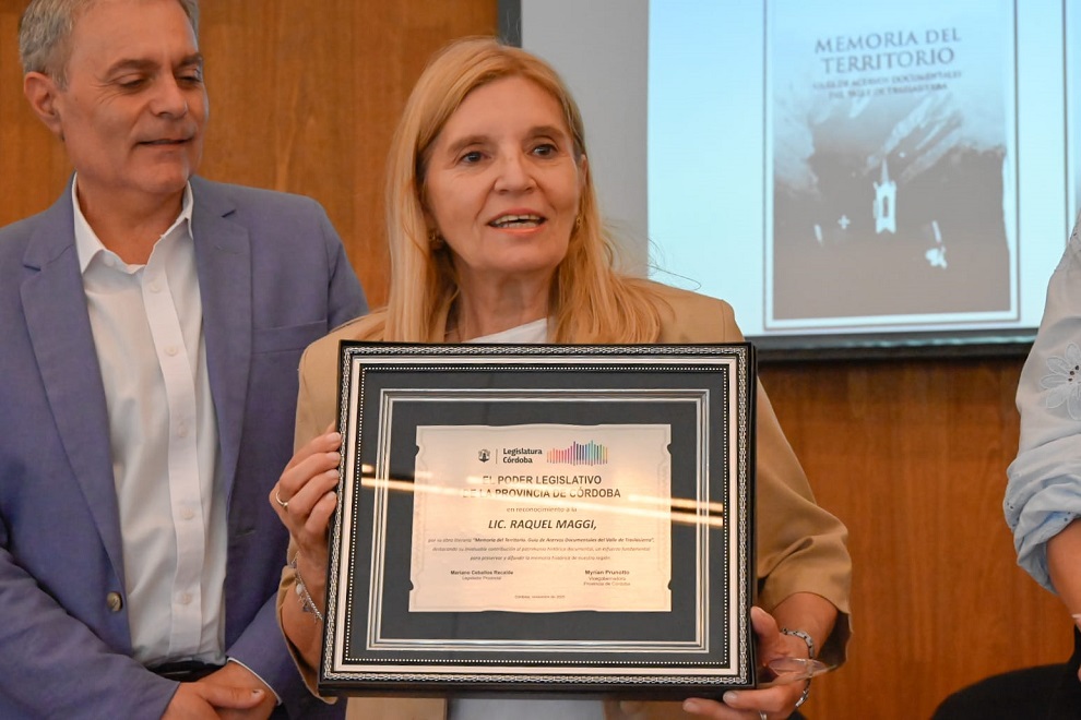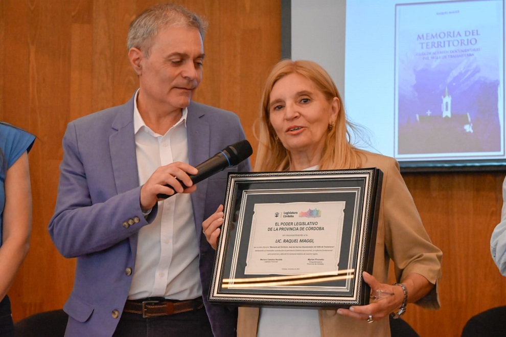 Este martes, en la sede de la Unicameral cordobesa y por iniciativa del legislador Mariano Ceballos Recalde, se entregó un reconocimiento a la historiadora, archivista e investigadora del Archivo Histórico de la Provincia de Córdoba, Raquel Maggi, autora de “Memoria del Territorio. Guía de Acervos Documentales del Valle de Traslasierra”, un esfuerzo fundamental para preservar y difundir la memoria histórica de esta región.